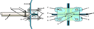 Keterangan : A. Tebal Panel Fiberglass B. Plat Besi Galvanis (200 mm x 200 mm x 4mm) C. Mur dan Baut Galvanis (12 mm x 100 mm) D. Karet Gasket E. Kupingan Plat strip galvanis (50 mm x 4 mm) F. Mu dan Baut Galvanis (12 mm x 150 mm) G. Pipa penguat galvanis (11/4) H. Lining fiberglass I. Mur dan Baut (12 mm x 70 mm) |